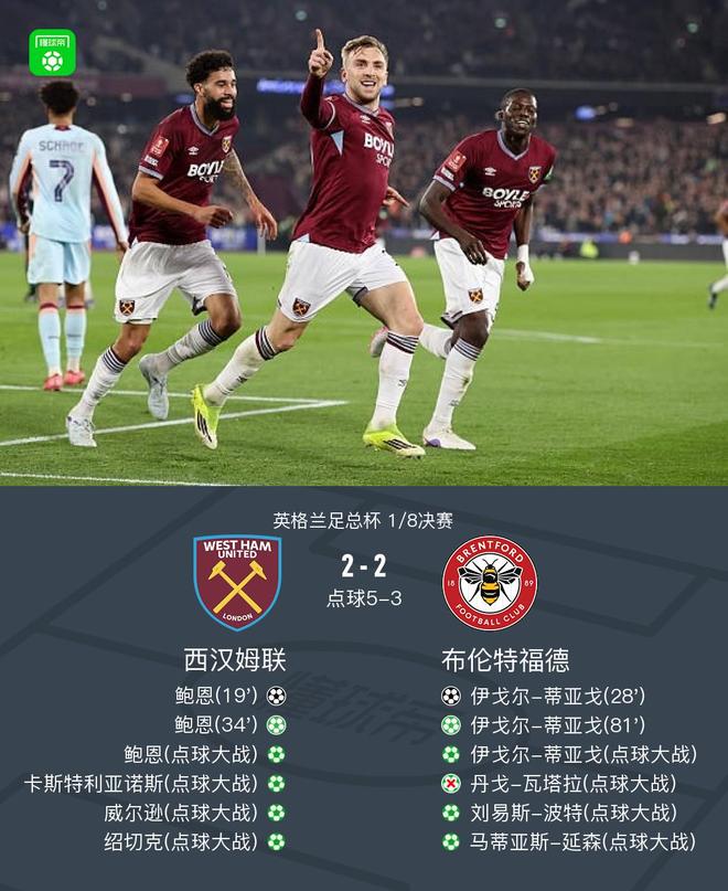 足总杯西汉姆联总分7-5点杀布伦特福德晋级,瓦塔拉点球被扑